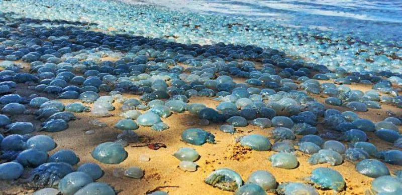 O vento carrega uma colônia de medusas marinhas para a costa. Todos os anos, nas praias de todo o mundo, milhares de colônias de medusas marinhas ficam presas. Lá, elas secam e morrem, tornando-se um “tapete crocante” de cadáveres desidratados cobrindo a areia,”
