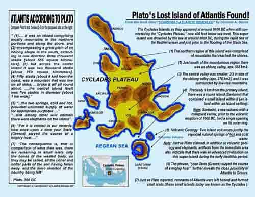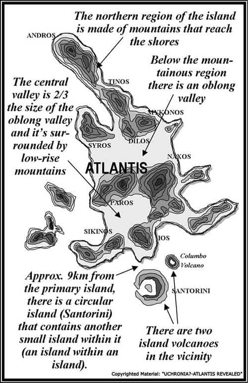 Mais especificamente, o estudo mostra que por volta do ano 9600 aC, quando de acordo com Platão a Atlântida flutuava sobre as águas, as atuais ilhas Cíclades estavam ligadas ao planalto das Cíclades, uma planície (agora a 400 pés abaixo do nível do mar); que fazia parte do território de uma ilha enorme. Quando esta ilha pré-histórica é comparada com a Atlântida de Platão, torna-se imediatamente evidente que deve ter sido a terra que Platão falou. Sua região norte era uma área montanhosa que alcançava a costa. Sob essa região montanhosa, havia um vale oblongo cuja superfície cobria 555 quilômetros quadrados. Por sua vez, abaixo desse vale oblongo havia outro vale menor, com cerca de 370 quilômetros quadrados de superfície, cerca de 2/3 do comprimento do vale oblongo. Esta era a ilha principal.