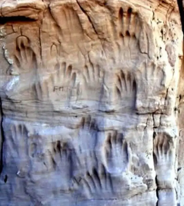 E embora as marcas de mãos aqui sejam muito maiores do que as de uma pessoa moderna, as pegadas provavelmente pertencem a crianças, já que um homem adulto não tem mais nada a fazer do que correr nas pedras e deixar marcas de mãos.