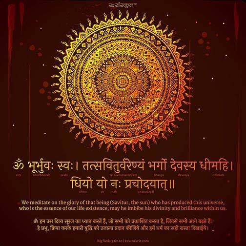 Om : o som primordial; Bhur : o corpo físico / reino físico; Bhuvah : a força vital / reino mental Suvah : a alma / reino espiritual; Tat : Isso (Deus); Savitur : o Sol, Criador (fonte de toda a vida); Vare – yam : adore; Bhargo : refulgência (luz divina); Devasya : Senhor supremo; Dh ī mahi : medite; Dhiyo : o intelecto; Yo : Que esta luz; Nah : nosso; Prachoday ā t: iluminar / inspirar.