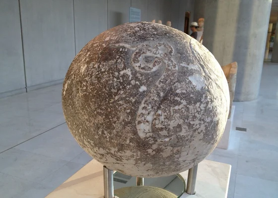 Uma bola de mármore, de aproximadamente 30 cm de diâmetro (11,8 polegadas), coberta com desenhos e símbolos misteriosos em alto relevo.
