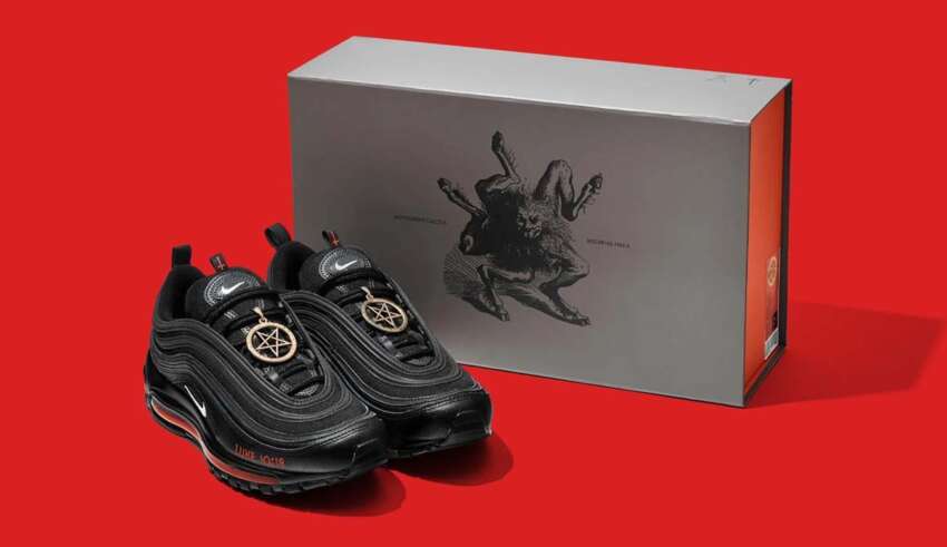 O tênis preto e vermelho, parte de uma colaboração entre Lil Nas X e o coletivo de arte MSCHF, baseado no modelo Nike Air Max 97, a Nike marca de roupas esportivas tenha negado qualquer colaboração de design. Em uma declaração enviada por e-mail à CNN, a Nike disse que não estava envolvida na criação dos sapatos modificados.
