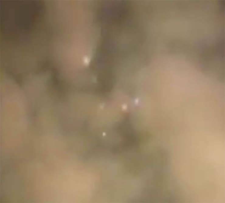 Parece haver um conjunto de luzes em forma de triângulo flutuando no mesmo local.