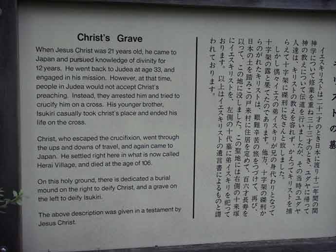 Quando Jesus Cristo tinha 21 anos de idade, ele veio para o Japão e buscou conhecimento da divindade por 12 anos. Ele voltou para a Judéia aos 33 anos e se engajou em sua missão. No entanto, naquela época, as pessoas na Judéia não aceitariam a pregação de Cristo. Em vez disso, eles o prenderam e tentaram crucificá-lo em uma cruz. Seu irmão mais novo, Isukiri casualmente tomou o lugar de Cristo na cruz. Cristo, que escapou da crucificação, passou pelos altos e baixos da viagem e voltou ao Japão. Ele se estabeleceu bem aqui no que agora é chamado Herai Village, e morreu com a idade de 106 anos. Neste solo sagrado, é dedicado um túmulo à direita para deificar a Cristo, e uma sepultura à esquerda para deificar Isukiri. A descrição acima foi dada em um testamento por Jesus Cristo”.